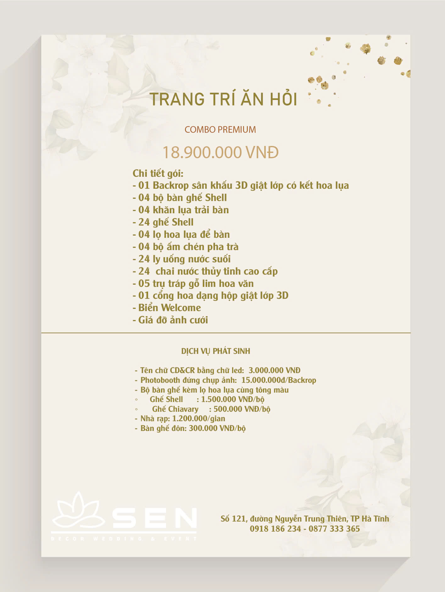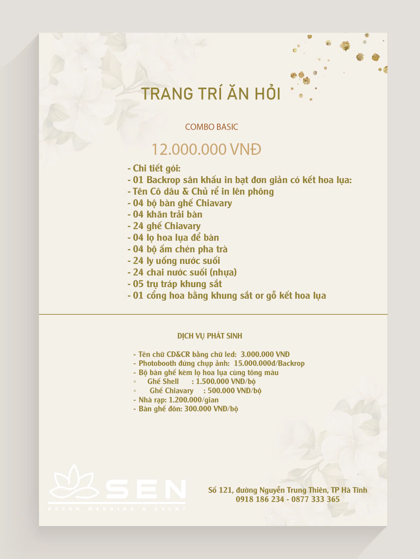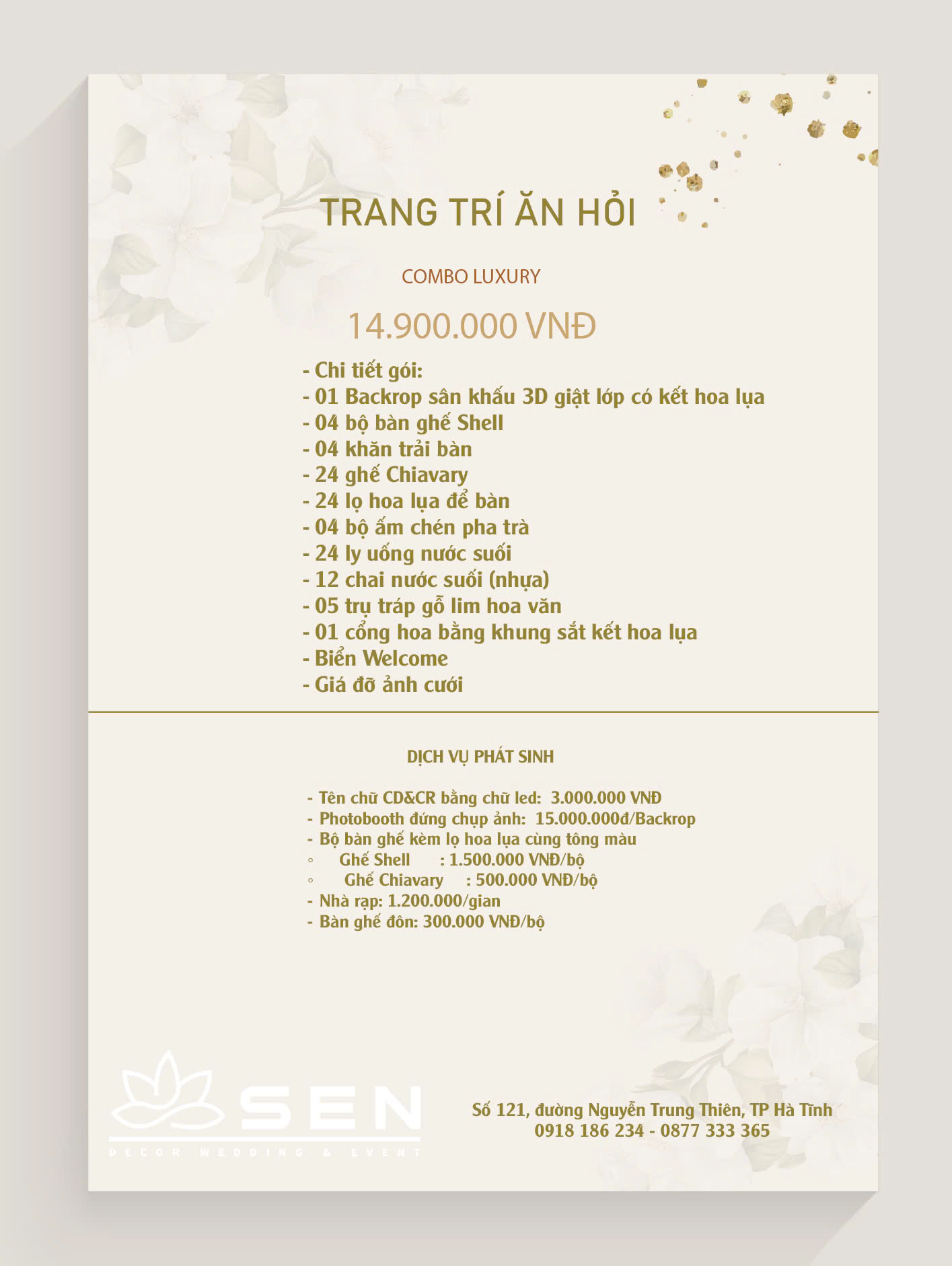 Sen Decor Wedding & Event là sự lựa chọn số 1 tin tưởng của quý khách hàng và là 1 trong những nhà tổ chức sự kiện chuyên nghiệp tại Hà Tĩnh cung cấp cho khách hàng dịch vụ chính, bao gồm: Dịch vụ Tiệc cưới, Dịch vụ Hội Nghị – Hội Thảo, Dịch vụ Tiệc Outside Catering, Dịch vụ Tiệc sinh nhật và Dịch vụ Wedding Planner.